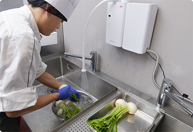 手をかざすだけで殺菌水が出るので、希釈作業が完全になくなり、作業効率が劇的に向上しました。学生も自分たちで洗浄殺菌工程を担当できるようになり、教育の面でもプラスになっています。また、レストラン実習では生の野菜を使う機会が非常に多いのですが、ピュアスターなら大量でもスムーズに処理できます。 -