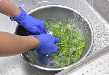 主に野菜類やハーブの洗浄・殺菌に使っています。手をかざすだけで適切な濃度の殺菌水がすぐ使えるので、準備の手間が大幅に減りました。急に「ハーブを追加で使いたい!」という場面でも、以前のように急いで希釈液を作る必要がなく、学生自ら、すぐ対応できるのが非常に助かっています。「急いでコレしてきて」って手をかざすジェスチャーをすることで、みんな理解しています(笑)。特に今年度からレストラン実習が本格的に始まり、仕込み量も増えたため、使用頻度は一気に高くなりました。