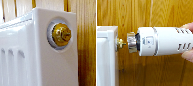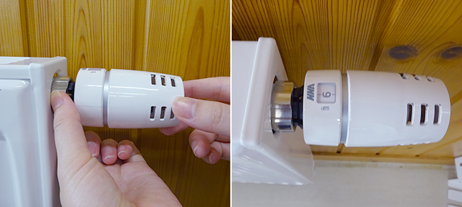 サーモスタットバルブ(以下「バルブ本体」という)を取り付ける前に、バルブ本体の温度調整スケールを『9』に合わせます。