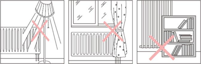 熱がこもるような場所では早く作動しますので、近くに障害物を置いたり、カーテン、覆いなどがかからないように注意してください。