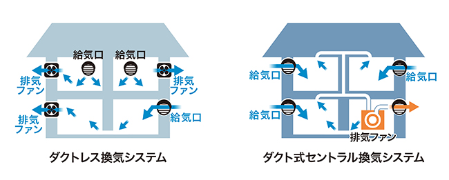 ※どちらも給気は壁に設置する給気口から、排気によって生じる圧力差で自然に給気します。